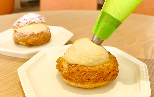 親子で楽しくお菓子づくり体験!! Piene Caféのパティシエと一緒にカスタードスイーツを作って学ぼう!カスタードクリームを作って、シュー生地の中に絞りトッピングをして世界で1つだけのオリジナルシュークリームを作ろう! 作りたてのシュークリームの試食を楽しんでみましょう。
