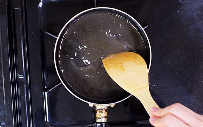 〈タレ〉の福神漬液とだしと水を鍋で煮立たせ、火を止めて水溶き片栗粉を加える。再度火にかけ、透き通るまで混ぜる。