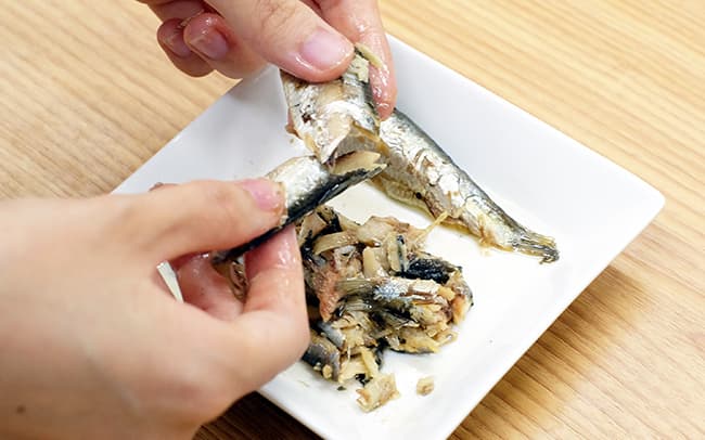 オイルサーディンの油をキッチンペーパーでとり、軽くほぐしておく。(フォークなどを使うと手を汚さずほぐせます。)