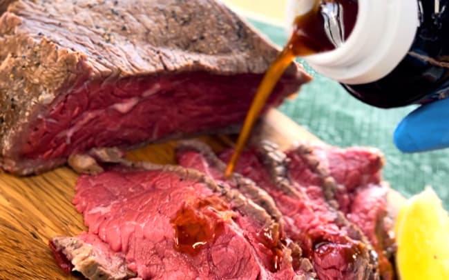 ラップとホイルを剝がしてスライス、トラジのたれをかけたら完成!